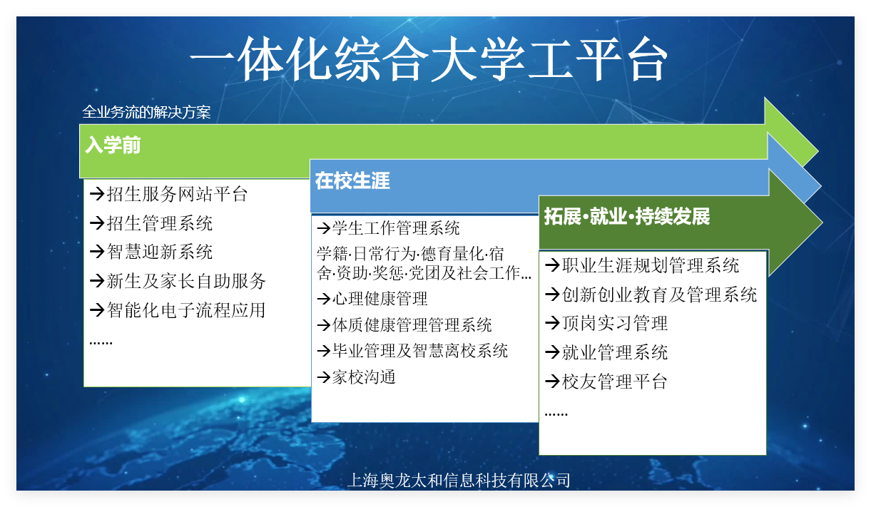 学生工作管理系统涵盖学校学生工作的所有环节,包括入学迎新、学生基本信息、学生学籍及异动管理、学生事务、助学管理、宿舍管理、沟通管理、活动、综合测评、家校沟通、毕业离校等方面,基于校园网/互联网为学校学生工作提供先进、实用的信息化管理手段,为学生、班主任及管理人员提供简便、快捷的网络化信息服务。